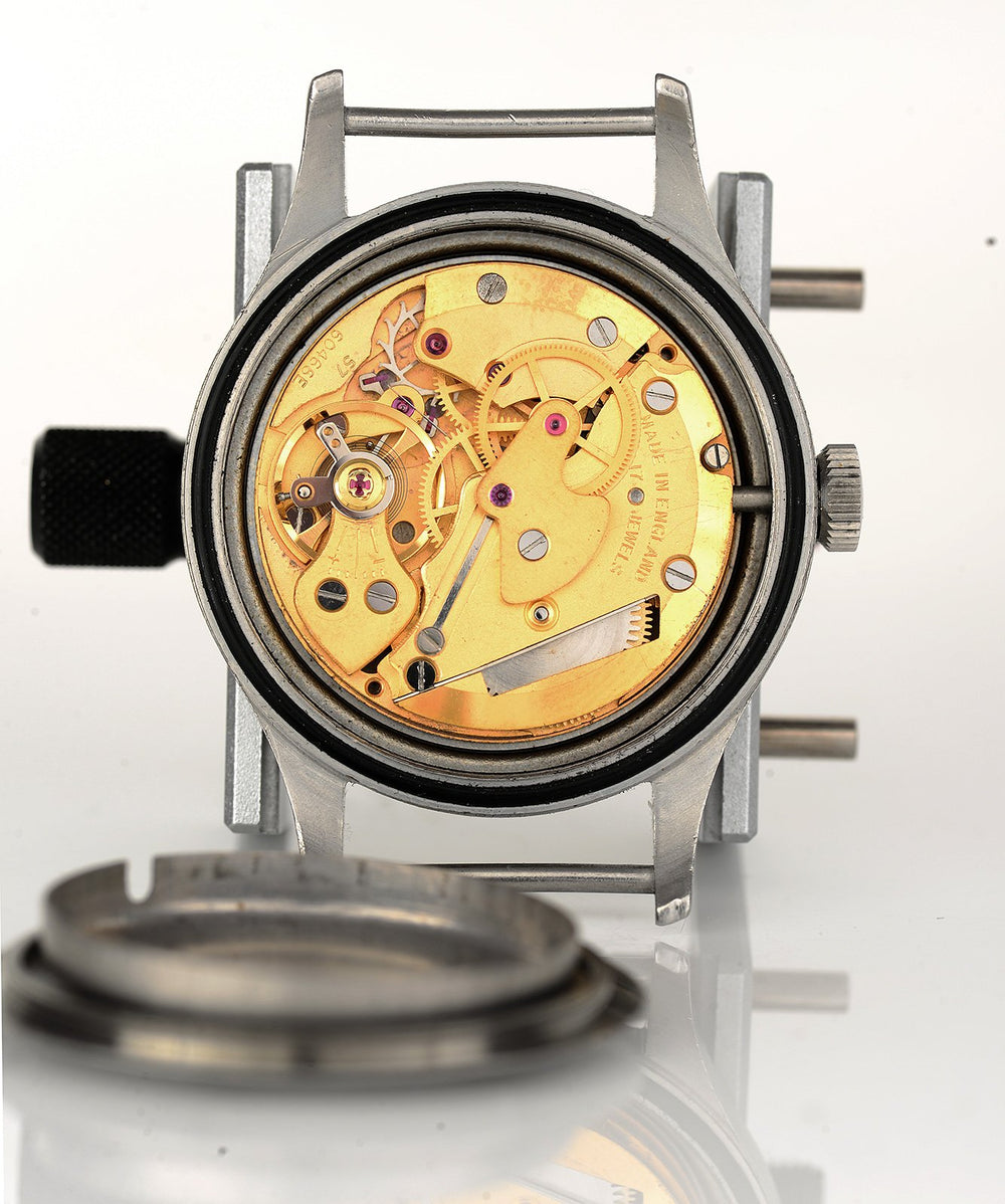 The movement of the watch is Smiths 27.CS which has been significantly improved over the standard Smiths offering. The movement also features a device to stop the mechanism when the winding crown is pulled out, this allows the movement to be accurately set to a reference time source and was part of the military specification.